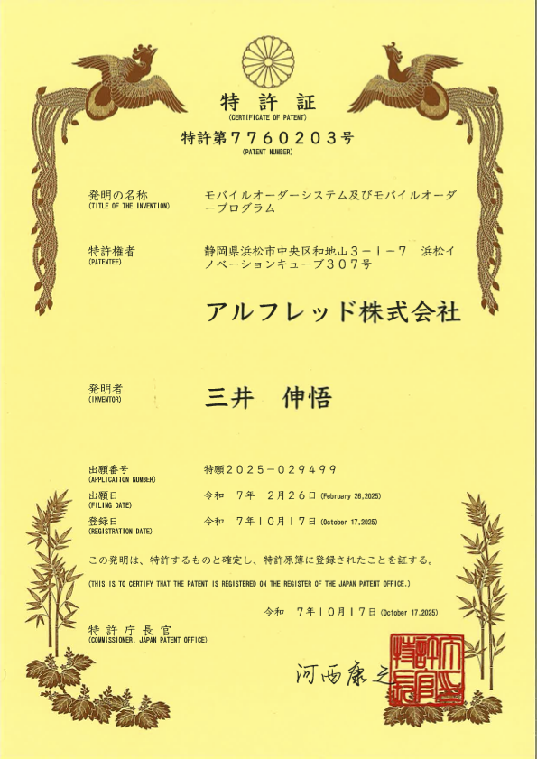 特許取得のお知らせ - モバイルオーダーシステム「アルモバ」